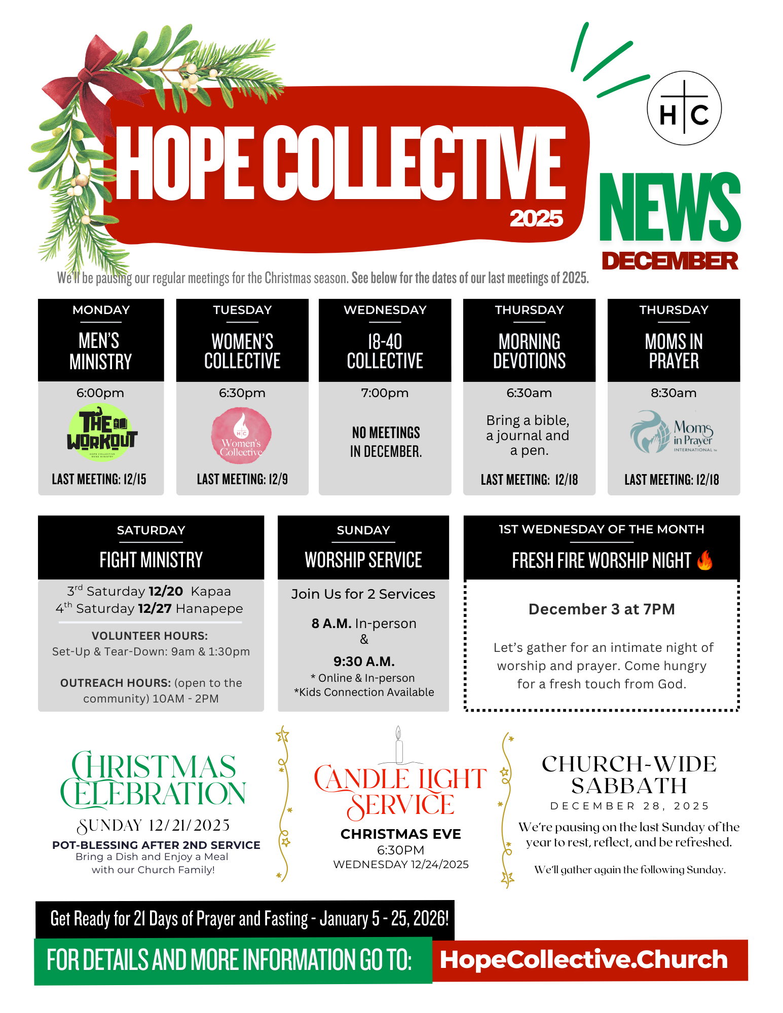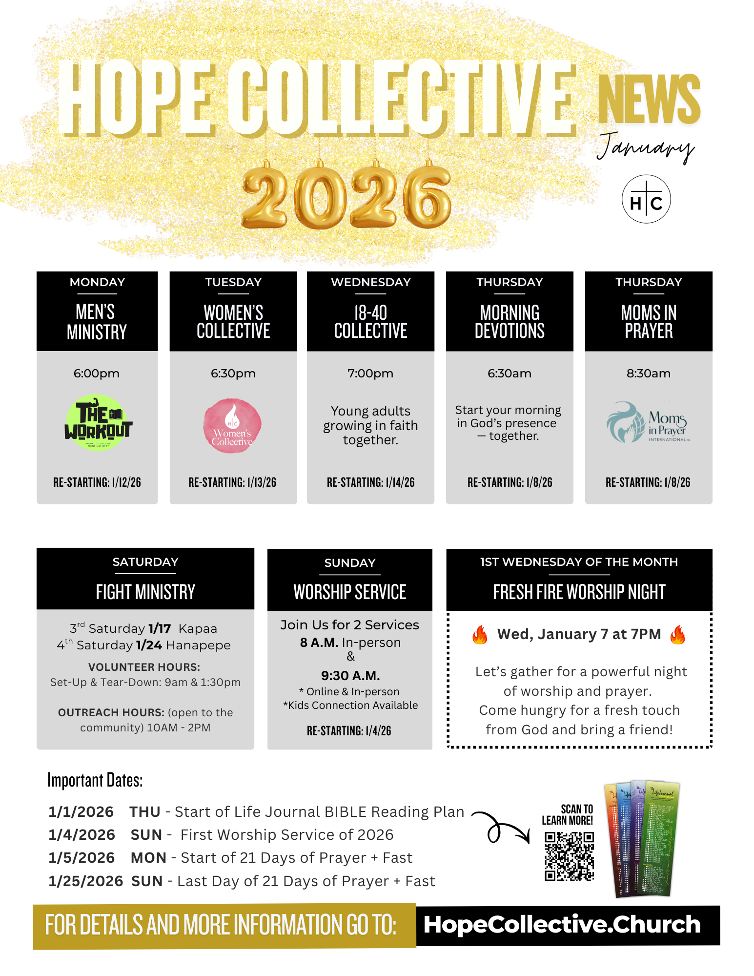 The vision of Hope Collective is to Reach and Restore our community with the love, acceptance and forgiveness of Jesus, and Release hope by equipping people to know their identity and destiny in Christ.